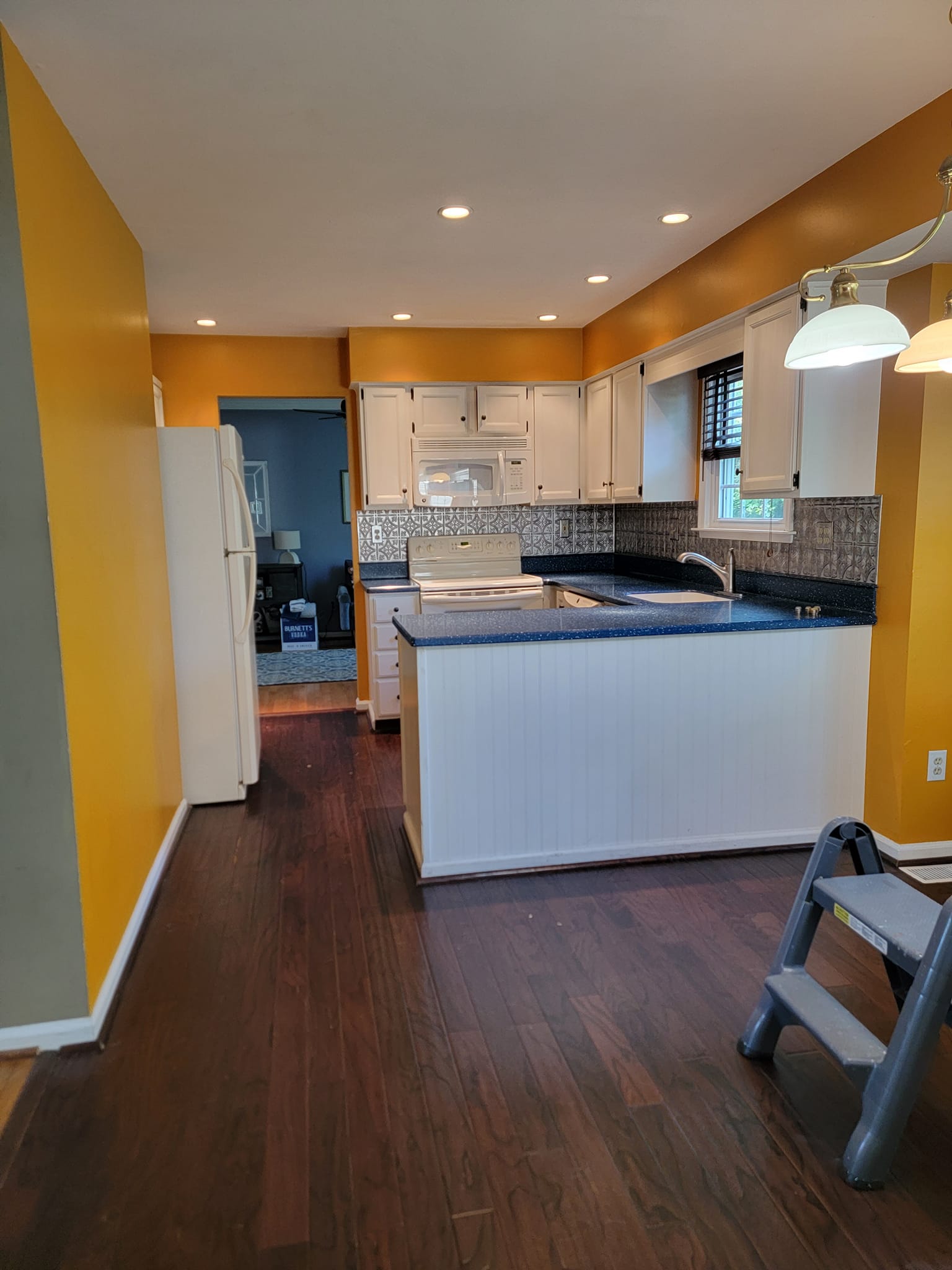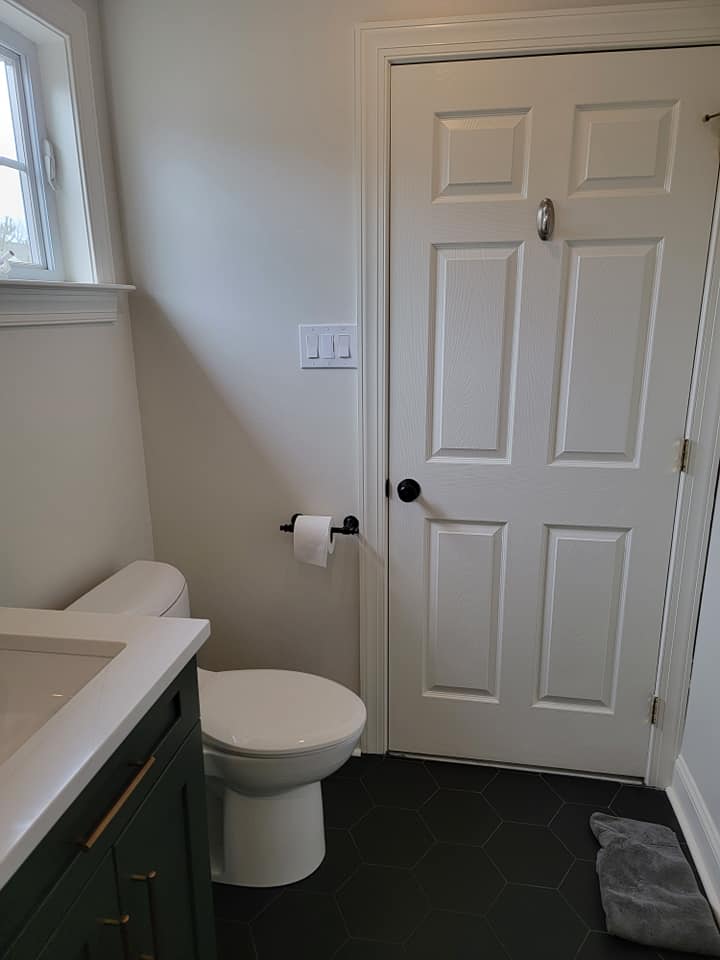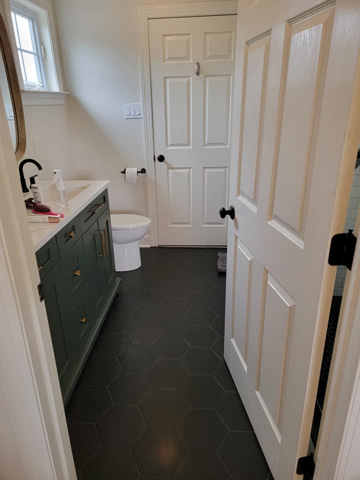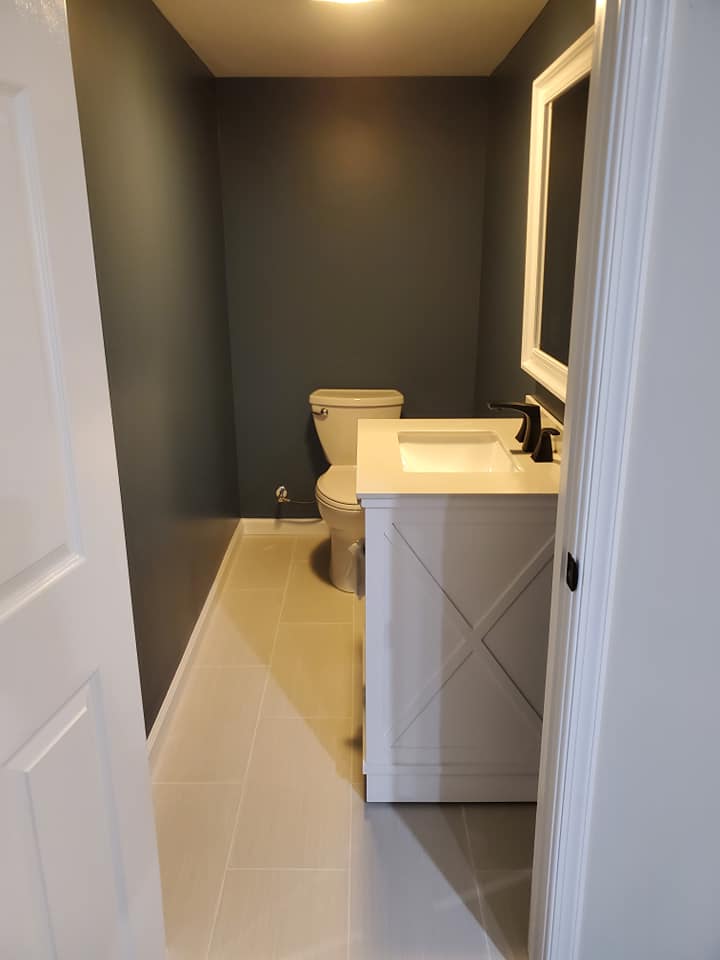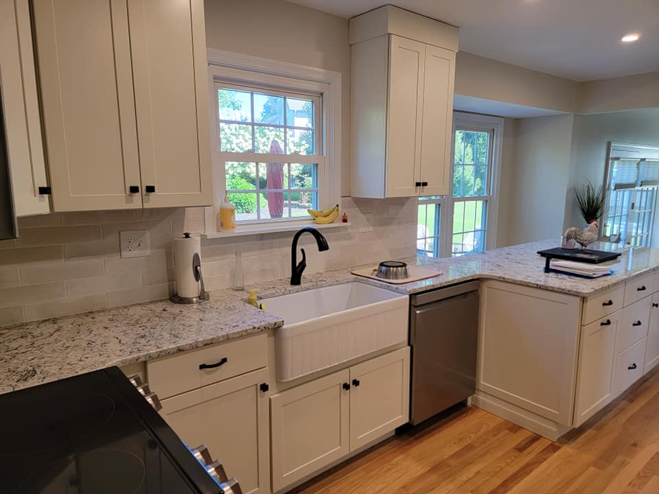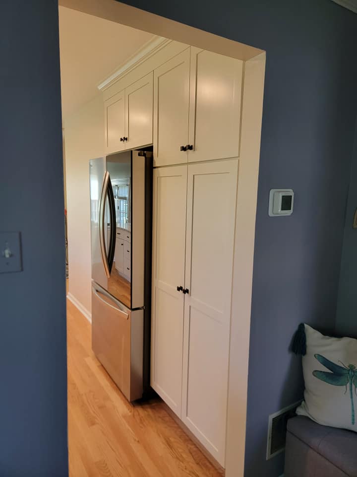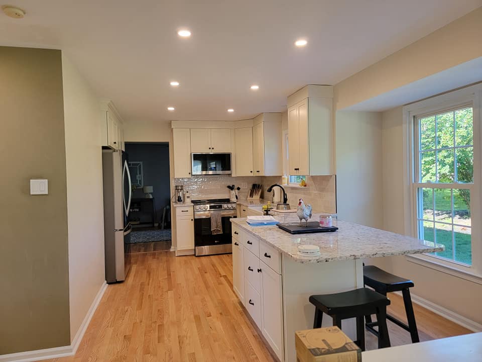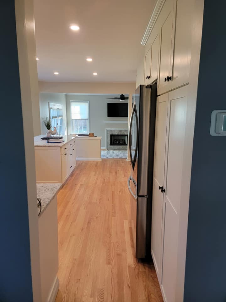Added a pantry. Removed a closet. New hardwood in the kitchen to match existing wood. Whole first floor hardwood was sanded and finished. We added a plash of color in the family room as well as relocated 4 new recessed lights and tile around the fire place. All and all Ms Kelley’s home is absolutely stunning!!