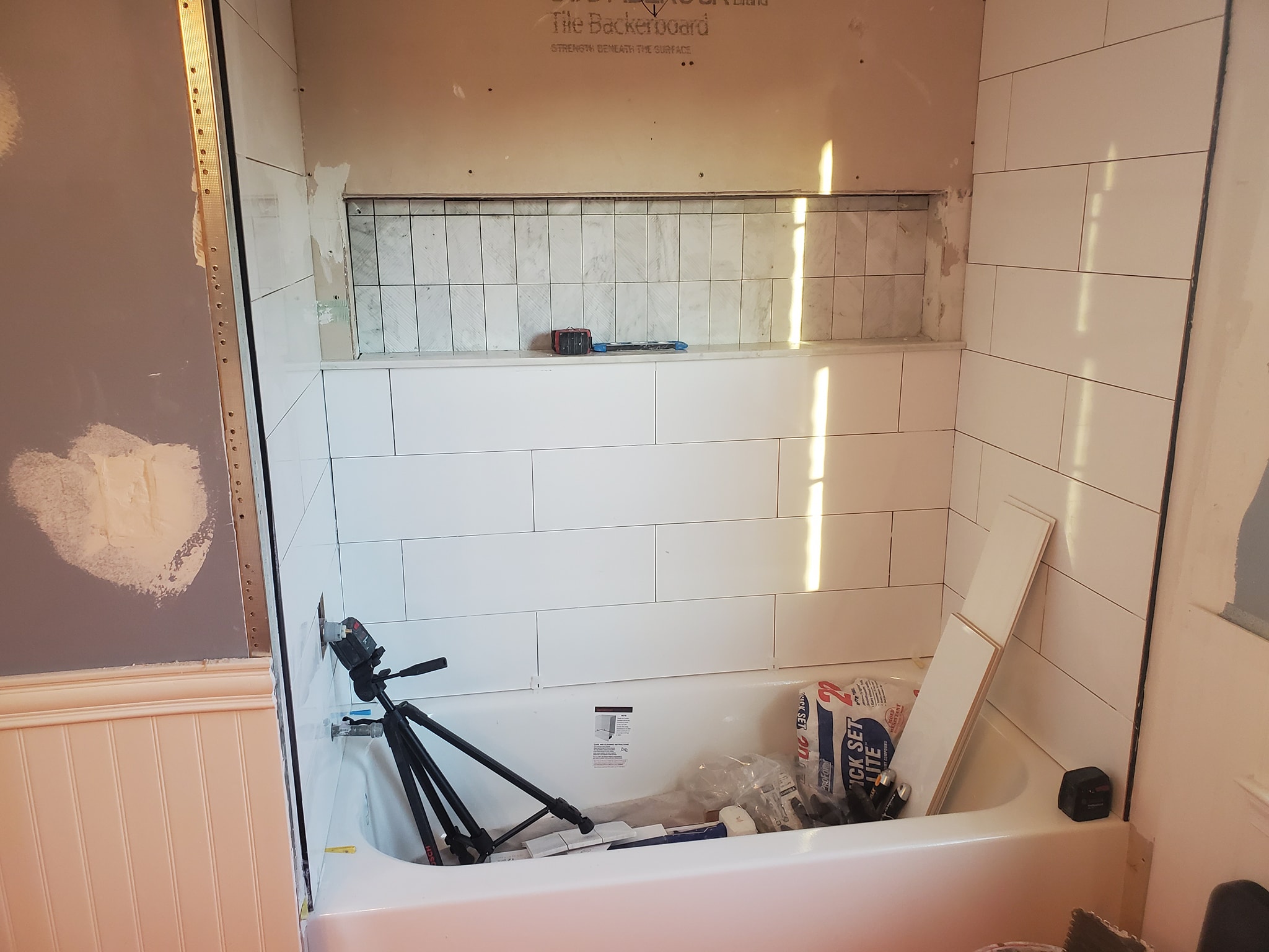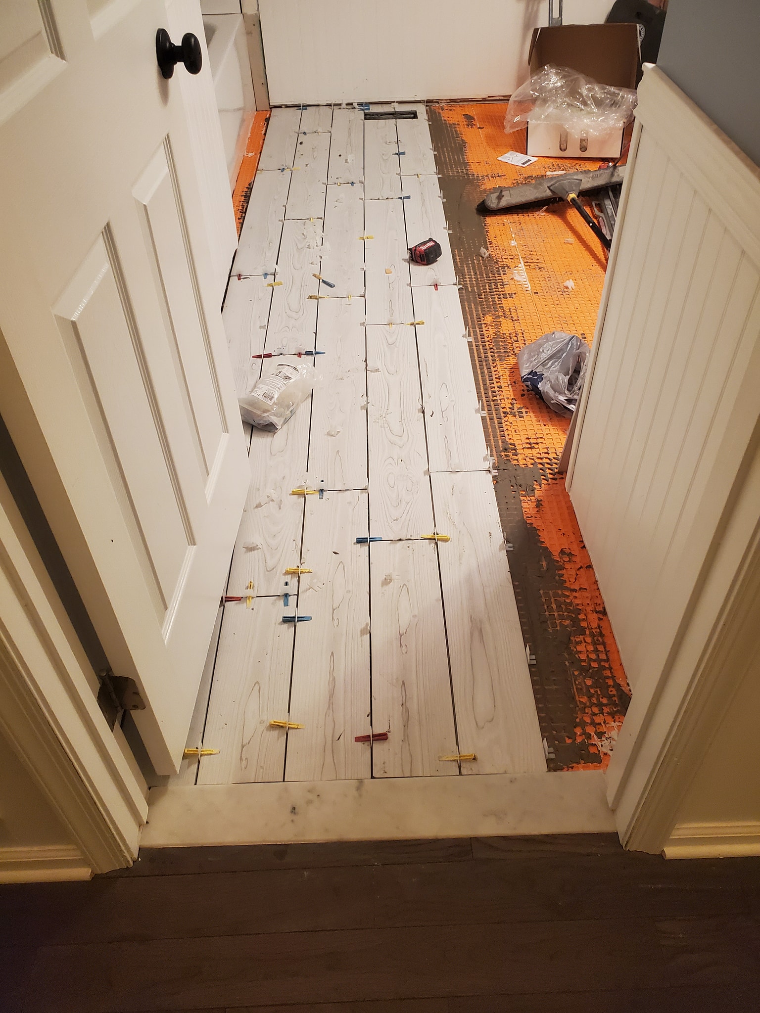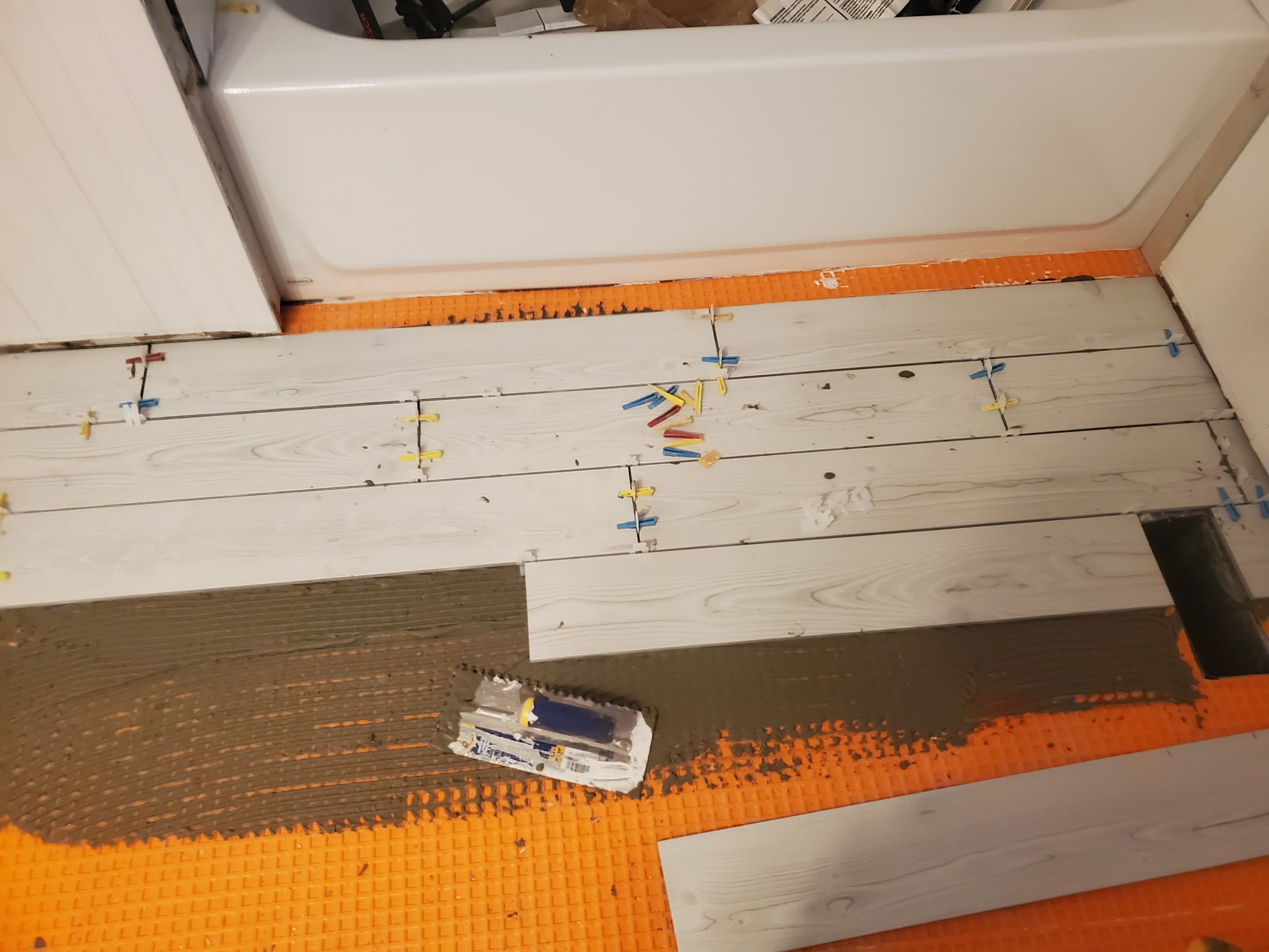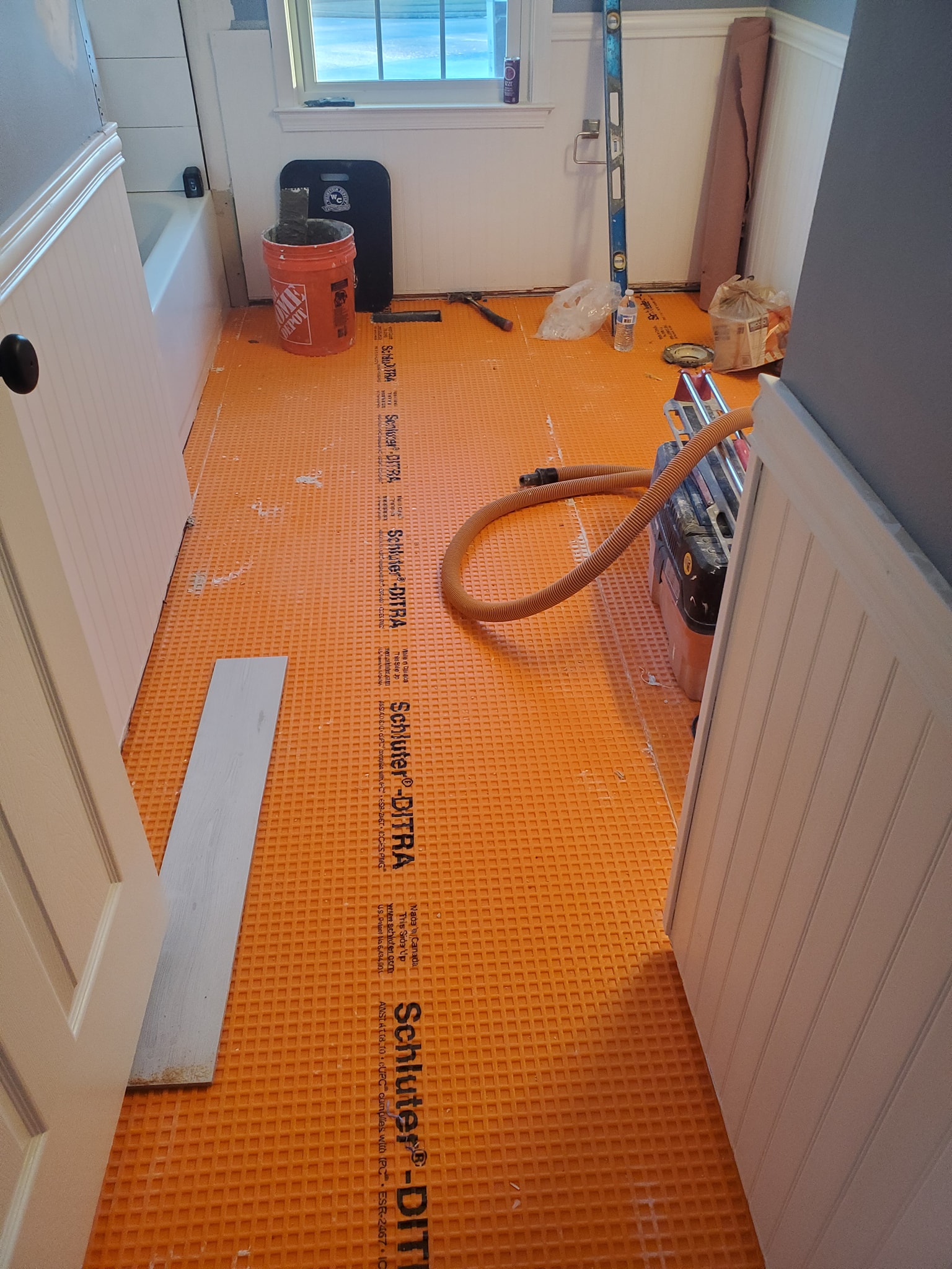 We relocated the 3 inch drain line into the floor joist.